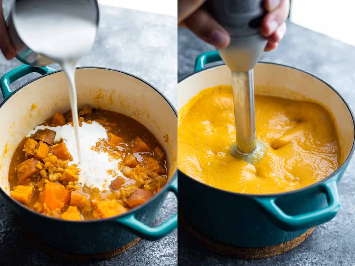 - Using an immersion blender, puree the soup until smooth and creamy. Stir in the coconut milk and lime juice.